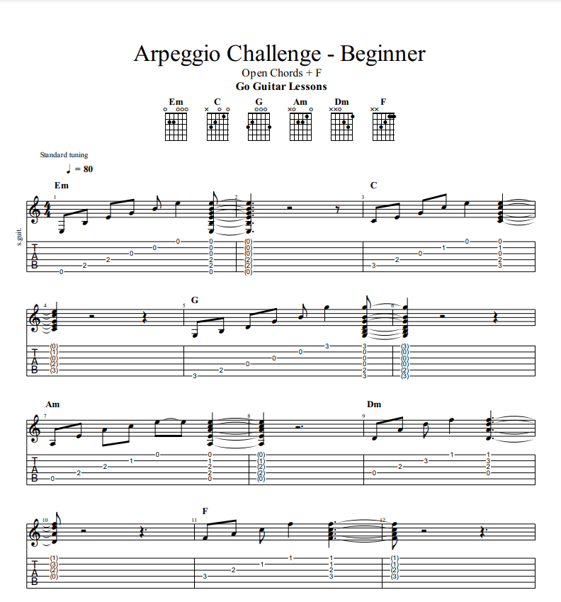 If you're a beginner learning how to play open and introductory-level chords, this challenge is a great starting point! It focuses on chord clarity by having you arpeggiate the chords and ensuring that each note rings out cleanly.