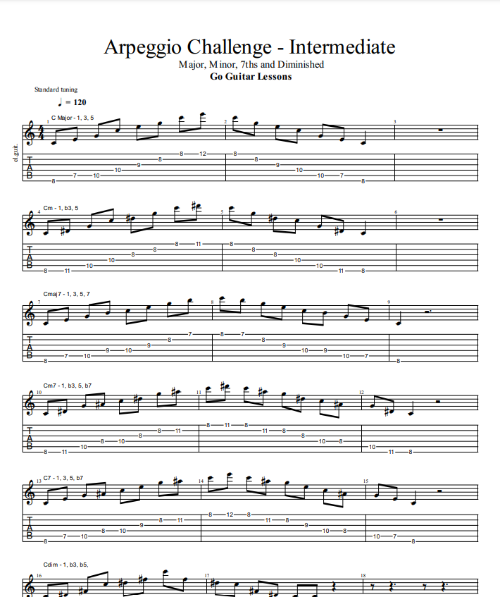 The Goal: Your aim is to be able to play all of the 3-note arpeggios in groups of 3, and all of the 4-note arpeggios in groups of 4, at a speed of 140 BPM using a metronome, the MIDI audio, or the Guitar Pro file.